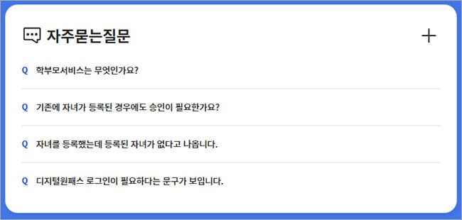 학부모서비스를 이용하시면서 자주 묻게 되는 질문들을 모아 놓은 메뉴입니다. 궁금한 사항이나 메뉴에 접근하기 어려울 때는 본 메뉴를 통해 궁금증을 해결하시기 바랍니다.