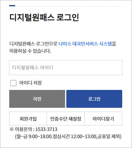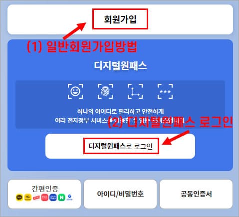 홈페이지 메인에서 위와 같이 “회원가입” 또는 “디지털원패스로 로그인”을 눌러 주세요. 회원가입을 하신 후에라도 나중에 중요한 정보를 봐야 할 때, “간편인증”을 통해 로그인을 하셔야 되는 경우가 있습니다. 처음부터 본 서비스를 편리하게 이용하고 싶으신 분은 “디지털원패스로 로그인” 기능을 이용하시는 게 좋습니다. 디지털원패스 가입은 바로 아래에서 설명해 드리고 있습니다.