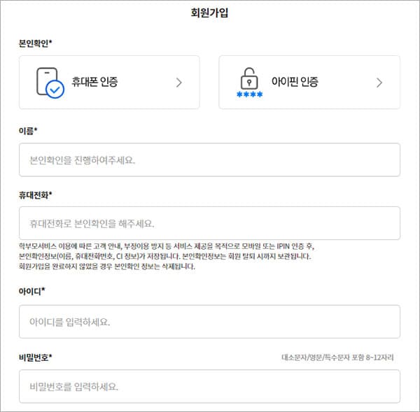 회원가입 과정은 이용약관 동의, 본인확인 그리고 이름, 휴대전화, 아이디, 비밀번호를 입력하는 일반 가입 과정입니다. 가장 아래 “자녀 소속 교육청”을 선택하는 부분이 있는데, 자녀의 학교나 유치원이 소속된 지역의 교육청을 선택하시면 됩니다.
