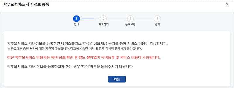 학부모서비스에 로그인 하신 후에는 자녀 정보를 등록해야 합니다. 자녀 등록 메뉴에서 “유치원 자녀 등록” 또는 “초중고 자녀 등록” 버튼을 누르면 위와 같이 학부모서비스 자녀 정보 등록 팝업창이 나옵니다. 차근히 읽어 보신 후, “다음” 버튼을 눌러 주세요.