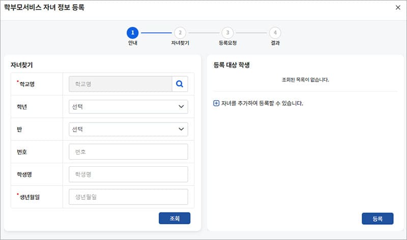 자녀 찾기 기능을 통해 자녀를 찾으신 후, “등록” 버튼을 등록 요청을 해주세요. 자녀가 직접 나이스 학생서비스(나이스플러스 학생계정)로 로그인 후, “나의 정보관리” 메뉴의 보호자 승인관리에 들어가서 확인해 보면 학부모가 승인 요청을 한 내용이 나오는데, “승인”을 눌러 등록을 하면 됩니다.