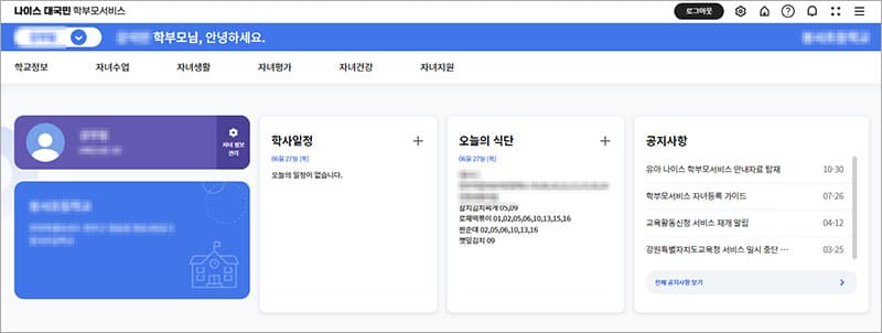 위와 같이 나이스 학부모서비스 초기화면이 구성되어 있는데요. 자녀의 이름과 학년, 반, 번호, 학교이름, 학교주소 등을 바로 확인할 수 있고, 학사일정과 식단까지 자세하게 나옵니다.