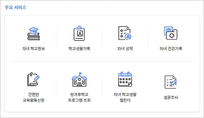 - 자녀 학교정보 : 학교 기본 정보 및 현황, 월간 학사 일정, 주간 식단 및 월간 식단, 과목 및 담당교사, 교과용 도서, 교육비 납입현황