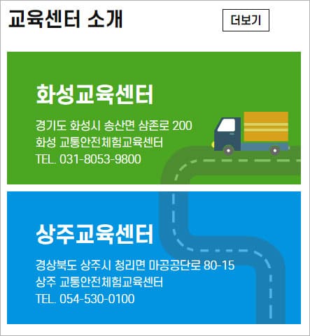 보수교육(집합교육)을 위해서 교육센터에 방문하시는 분들은 교육에 따라 본사, 상주 교통안전체험교육센터, 화성 교통안전체험교육센터를 방문하실 수 있습니다.