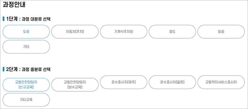 - 도로 : 교통안전담당자(신규교육), 교통안전담당자(보수교육), 운수종사자(제주), 운수종사자(강원), 교통약자서비스종사자, 기타교육