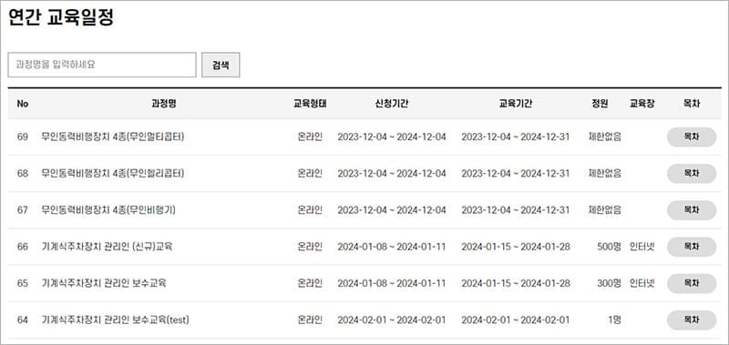 한국교통안전공단 배움터에서 진행하는 연간 교육일정 안내입니다. 특히 요즘 많은 분들이 관심을 가지고 있는 무인동력비행장치 4종 교육과 기계식주차장치 관리인 교육 등 자격증과 보수교육 등을 모두 받으실 수 있습니다.