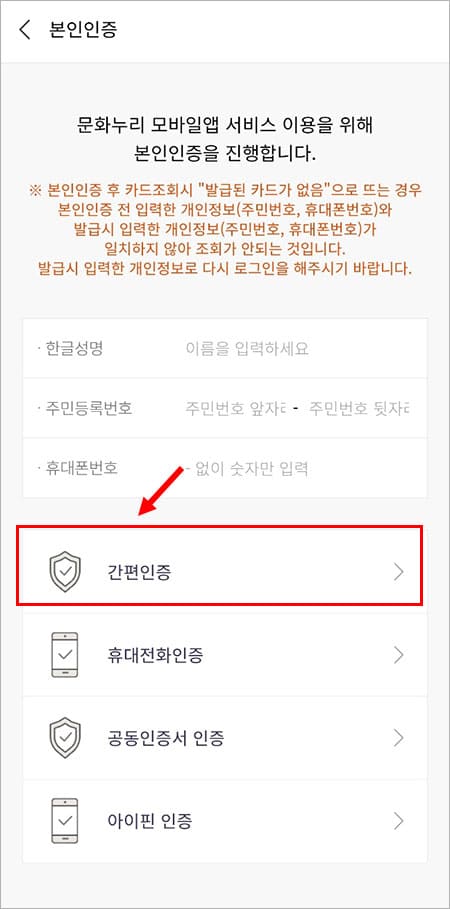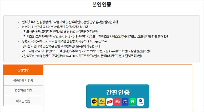 문화누리카드 잔액조회를 위해서는 본인 인증 절차를 거쳐야 하는데요. 간편인증, 공동인증서 인증, 휴대전화 인증, 아이핀 인증 등 다양한 방법으로 인증을 할 수 있습니다. 많은 분들이 사용하는 간편 인증으로 편리하게 인증을 하신 후에 바로 잔액 조회를 할 수 있습니다.