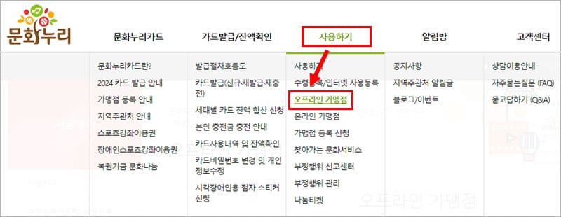문화누리카드 사용처 중에서 먼저 오프라인 사용처를 확인 방법에 대해 알아볼게요. 문화누리카드 홈페이지 상단 메뉴에서 ‘사용하기 > 오프라인 가맹점’을 눌러 주세요.