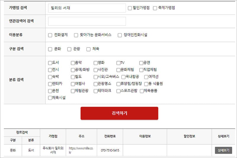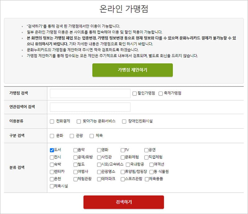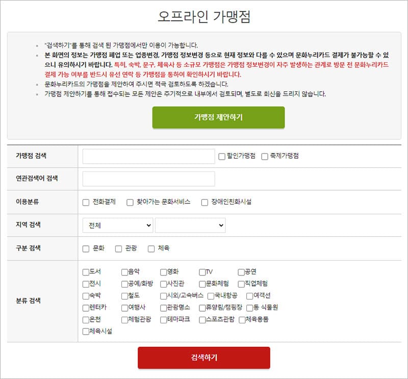 위의 이미지와 같이 오프라인 사용처를 검색하는 페이지가 나옵니다. 문화누리카드 사용이 가능한 모든 오프라인 매장을 검색할 수 있습니다. 가맹점 이름을 모를 경우에는 아래 지역, 구분, 분류 검색을 이용하면 빠르게 검색 결과를 얻을 수 있습니다.