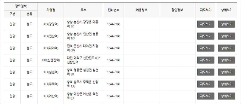 분류에서 ‘철도’를 선택한 후 검색한 결과가 위와 같이 나옵니다. 문화누리카드로 KTX같은 철도 교통시설도 가능하다는 것을 알 수 있습니다.