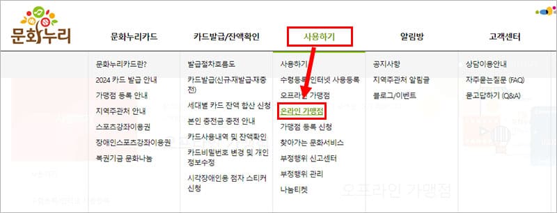문화누리카드 사용처 중에서 이번에는 온라인 사용처를 확인 방법에 대해 알아볼게요. 문화누리카드 홈페이지 상단 메뉴에서 ‘사용하기 > 온라인 가맹점’을 눌러 주세요.