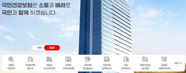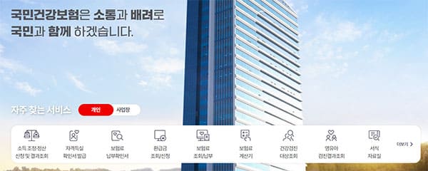 국민건강보험공단 홈페이지에서는 개인과 사업자가 편리하게 업무를 처리할 수 있도록 다양한 서비스를 제공하고 있습니다. 대표적인 서비스는 아래와 같습니다.