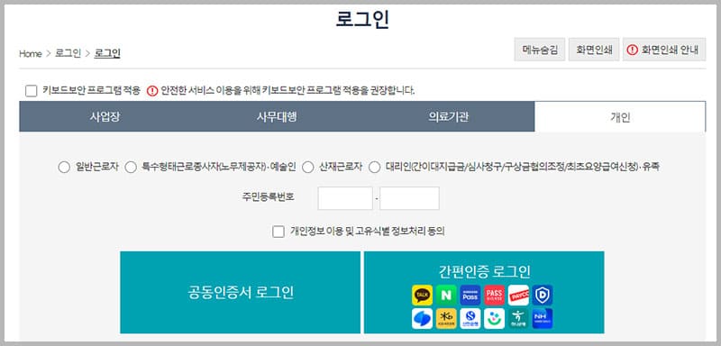 자격관리(근로자·피보험자) | 보험료신고 | 요양신청 | 간이대지급금 | 플랫폼종사자(노무제공자) |
