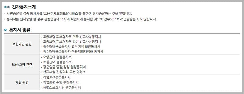 - 보험가입 관련 : 고용보험 피보험자격 취득 신고사실통지서, 고용보험 피보험자격 상실 신고사실통지서, 특수형태근로종사자 입직이직 확인통지서, 특수형태근로종사자 적용제외재적용 통지서