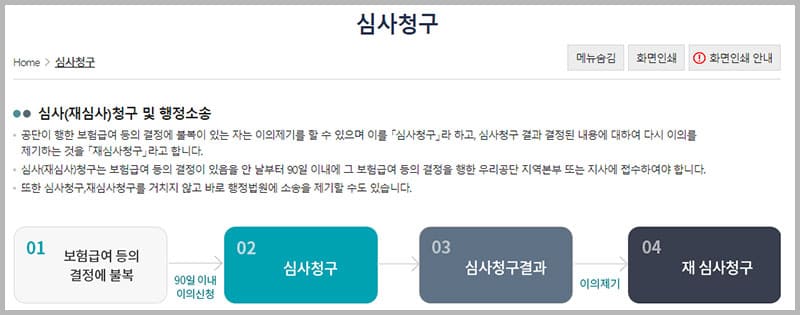 심사청구 서비스는 근로자가 근로복지공단의 결정에 불복할 경우, 이를 재심사 요청할 수 있는 기능입니다. 사용자는 심사청구를 통해 공단의 결정에 대한 이의를 제기할 수 있으며, 공단은 이를 다시 검토하여 최종 결정을 내립니다. 이 서비스는 근로자가 자신의 권리를 주장할 수 있는 중요한 경로입니다.