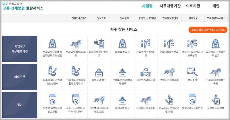 근로복지공단 토탈서비스는 고용보험과 산재보험에 관한 업무를 모두 처리할 수 있는 온라인 플랫폼입니다. 대표적으로 “사업장”, “사무대행기관”, “의료기관”, “개인”으로 섹션이 나뉘어져 있으며, 직관적인 메뉴 구조로 누구나 쉽고 빠르게 업무처리를 할 수 있습니다. 홈페이지 이동을 위해 위의 대표 이미지를 누르거나 아래 바로가기 링크를 클릭하시면 됩니다.