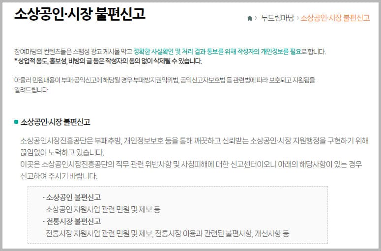 두드림마당은 소상공인이 겪는 불편사항을 신고하고 해결할 수 있는 공간입니다. 이곳에서는 소상공인과 시장의 불편신고를 접수받아 문제 해결을 위한 지원을 제공하며, 국민권익위원회와 연계하여 국민신문고를 통해 다양한 민원을 제기할 수 있습니다.