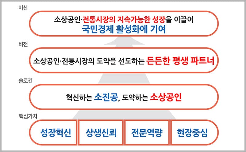 소상공인진흥원 및 시장경영진흥원을 통합하여 2014년 소상공인진흥공단이 정식 설립되었습니다. 공단의 설립 목적은 소상공인의 경영 안정과 성장 지원, 그리고 창업 활성화입니다. “소상공인과 전통시장의 도약을 선도하는 든든한 평생 파트너”라는 비전을 가지고, 소상공인이 지속 가능한 성장을 이룰 수 있도록 다양한 프로그램을 운영하고 있습니다.