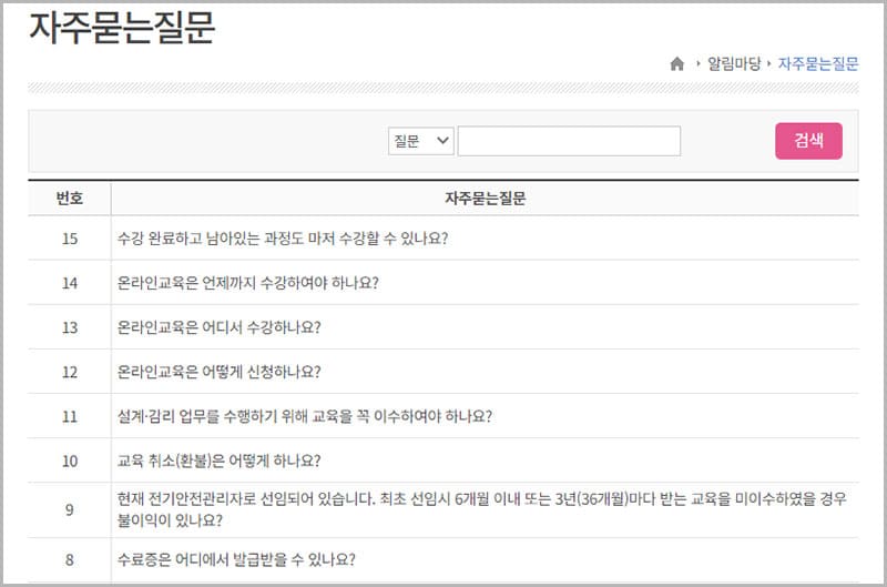 전기기술인협회 홈페이지에는 자주 묻는 질문(FAQ) 코너가 마련되어 있어, 사용자들이 궁금해하는 다양한 질문에 대한 답변을 제공합니다. 이 코너는 회원가입, 업무 절차, 교육 프로그램 등 다양한 주제를 다루고 있으며, 사용자들이 필요한 정보를 신속하게 찾을 수 있도록 돕습니다. FAQ 코너는 협회에 대한 이해를 높이고, 회원들이 보다 원활하게 서비스를 이용할 수 있도록 지원합니다.