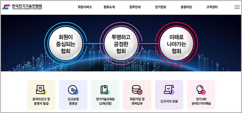 전기기술인에게 꼭 필요한 다양한 정보와 서비스를 제공하는 전기기술인협회를 방문해 보세요. 홈페이지 방문을 위해 위의 대표 이미지를 누르거나 아래 바로가기 링크를 클릭해 주세요.