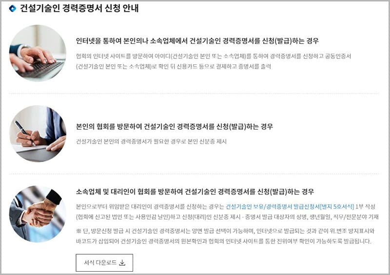 경력증명서는 건설기술인들이 자신의 경력을 공식적으로 증명할 수 있는 중요한 문서입니다. 협회 홈페이지에서는 경력증명서 신청 절차를 안내하고 있으며, 회원들은 온라인으로 간편하게 신청할 수 있습니다. 경력증명서는 취업이나 승진, 자격증 취득 등 다양한 상황에서 필요하므로, 회원들은 이 서비스를 적극 활용하여 자신의 경력을 증명할 수 있습니다.