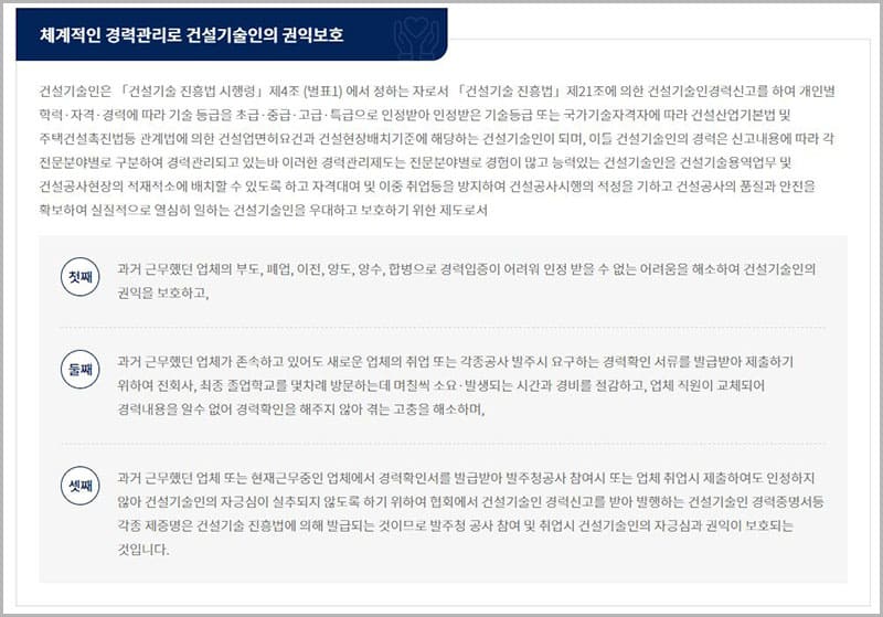 오늘은 건설기술인협회 경력신고, 경력증명서 발급 및 주요 서비스에 대해서 알아봤습니다. 건설기술인협회는 건설기술인들이 전문성을 높이고, 경력을 관리하며, 다양한 혜택을 누릴 수 있도록 돕고 있습니다. 앞으로도 회원들의 목소리를 반영하여 더욱 발전하는 협회가 될 것이며, 회원들은 이 홈페이지를 통해 지속적으로 자신의 경력을 쌓고, 전문성을 강화해 나갈 수 있을 것입니다.