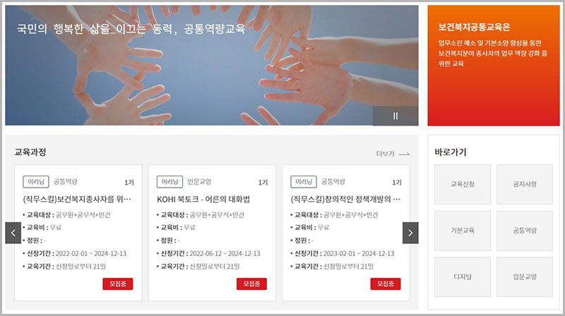 한국보건복지인재원 보건복지배움인 홈페이지에서는 보건복지 분야의 각종 교육 과정과 자료가 체계적으로 정리되어 있어, 관심 있는 분들에게 유용한 정보를 제공하고 있습니다. 홈페이지 방문을 위해 위의 대표 이미지를 누르거나 아래 바로가기 링크를 클릭해 주세요.