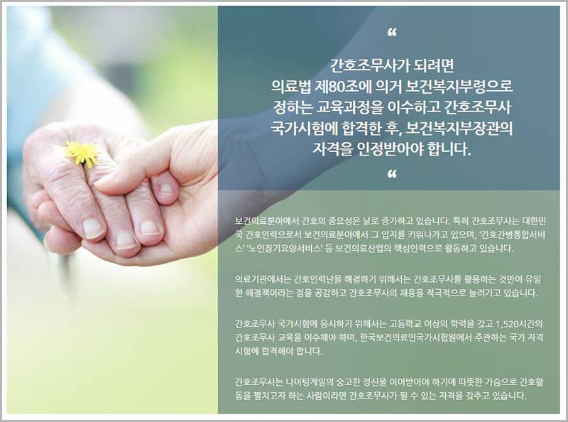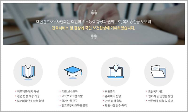 오늘은 우리나라 의료 인력의 한 축인 대한간호조무사협회 홈페이지에 대해 알아보겠습니다. 간호조무사는 의료기관에서 간호사와 함께 환자의 간호 및 관리 업무를 수행하는 전문 인력입니다.