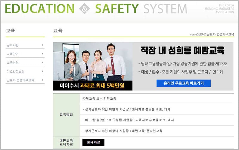 - 교육 : 교육안내, 교육신청, 기초안전보건, 근로자 법정의무교육